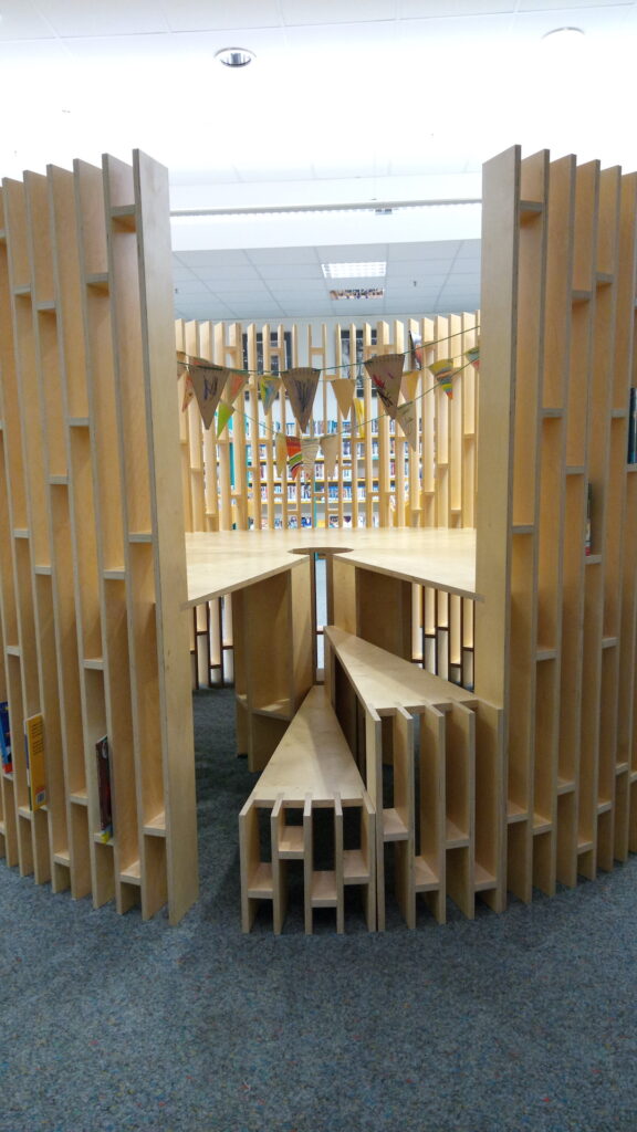# einwöchige Entwurfsphase mit einer Grundschulklasse, Ausstellung, Wettbewerb und öffentliche Mitbestimmung über das finale Möbelstück in der Bibliothek, Bau der „Lesetorte“ durch die VIA Blumenfisch gGmbH (Anerkannte Werkstatt für Menschen mit Beeinträchtigung) >>Dokumentationsheft