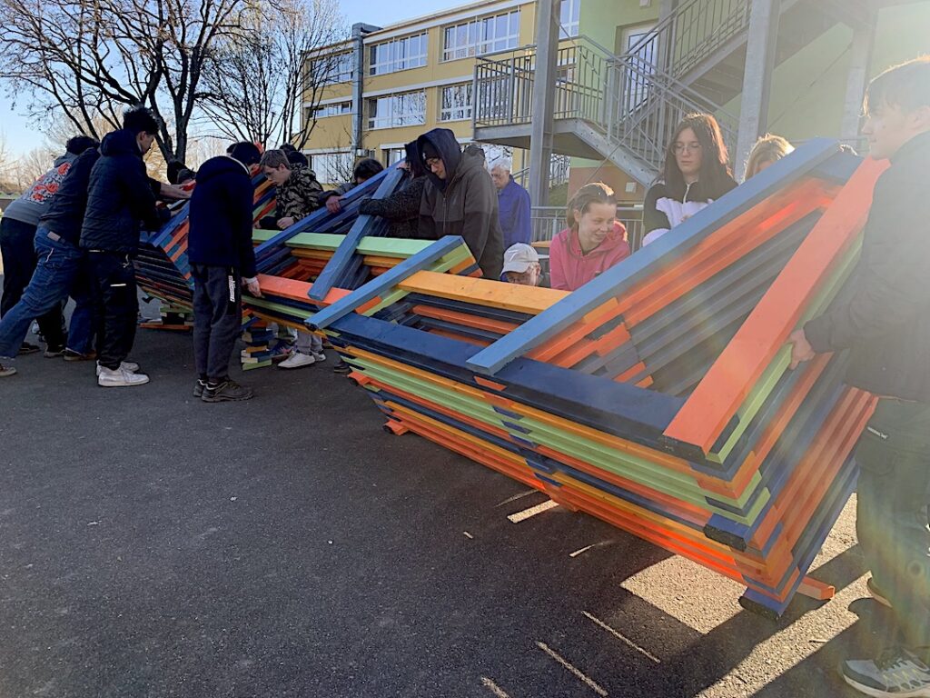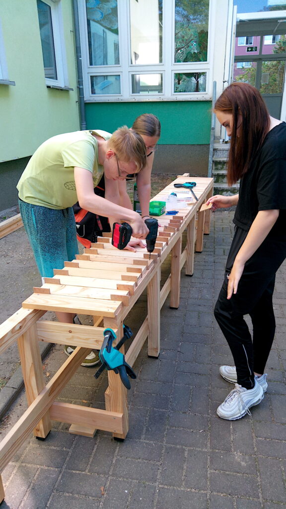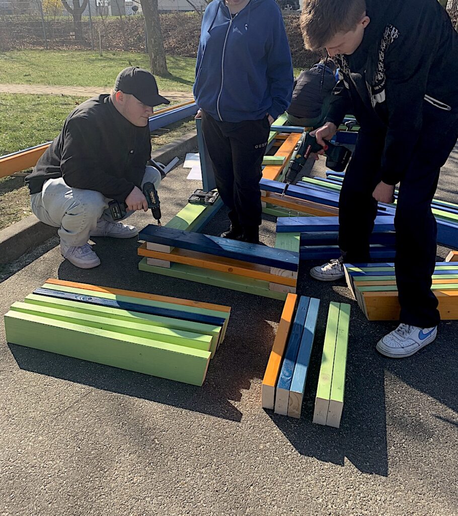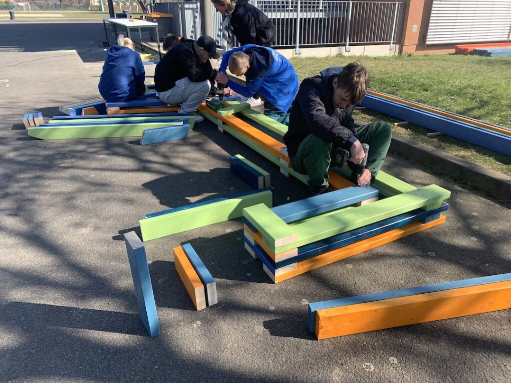 # Entwurf und Konzeption, Farbauswahl, Ortsbestimmung sowie gemeinsamer Bau mehrerer Schulhofmöbel