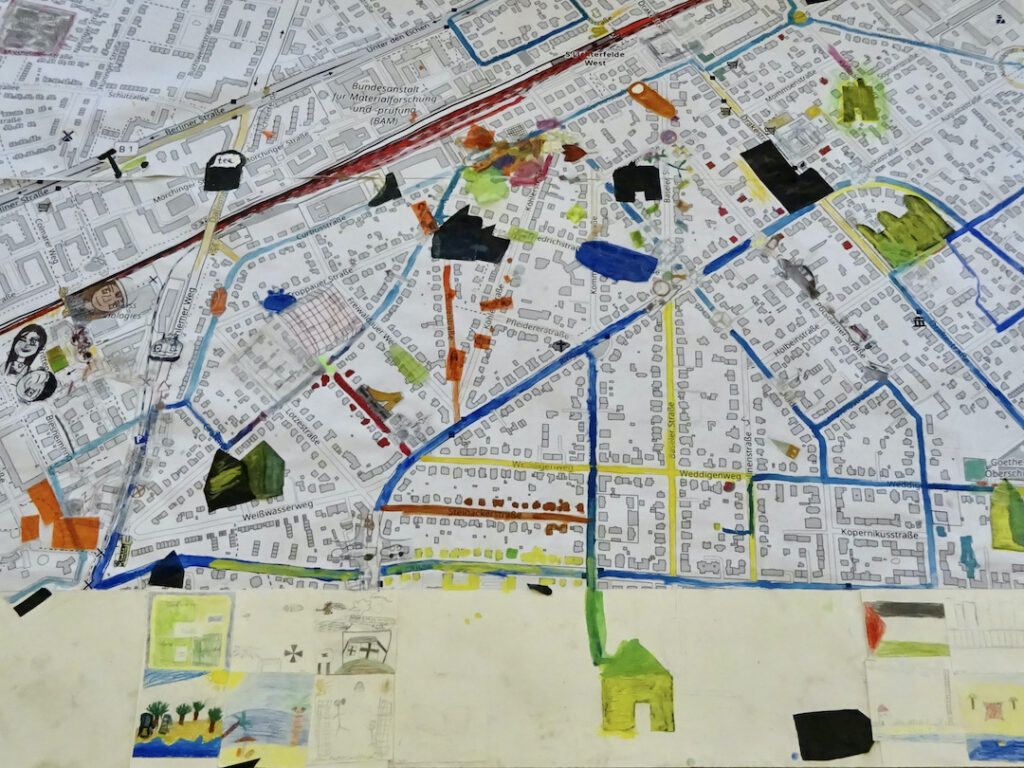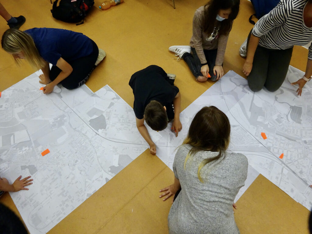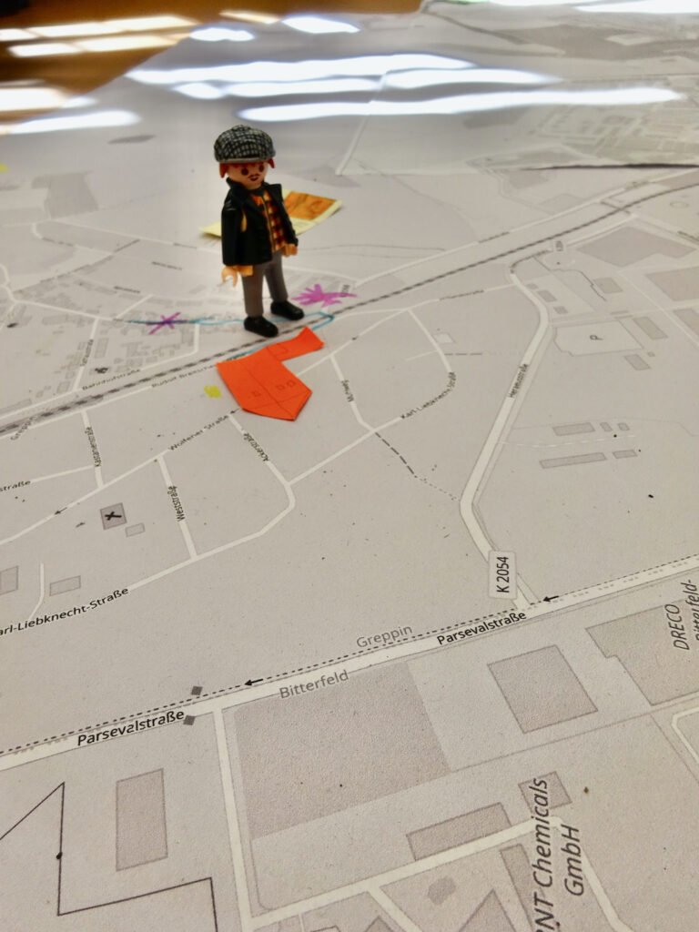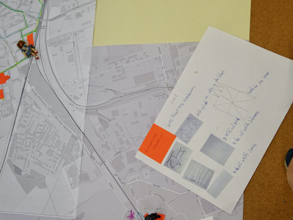 # spielerische Stadterkundungen mit Karte, Skizzenheft und Aufgabenkarten, Zufalls-Wege-Bestimmung mit Würfeln, Linsen, u.a., Spaziergangswissenschaften, FußgängerInnen als Phänomen, Neugestaltung einer Karte der eigenen Umgebung mit Ideen für städtebauliche Veränderungen